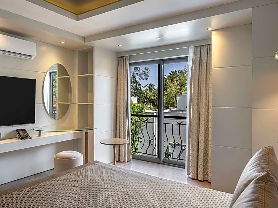 Tastefully decorated in warm colors, this room includes a flat-screen TV, air conditioning and a seating area. It also offers a balcony with views of the garden.